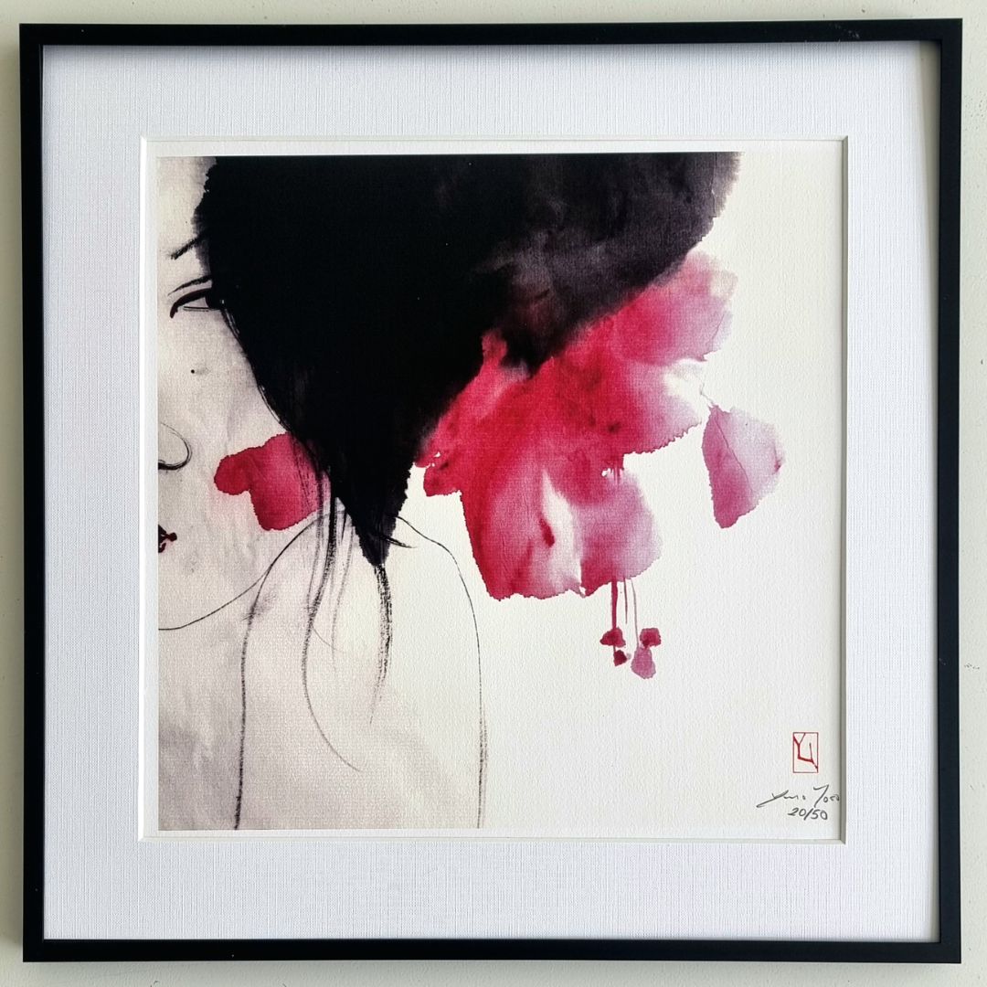 Each piece begins as a hand-painted work on rice paper. The artist then reinterprets the composition digitally, developing a final version specifically conceived for edition. The result is a distinct artwork in its own right, produced as a limited edition giclée rather than a direct reproduction of the original piece.